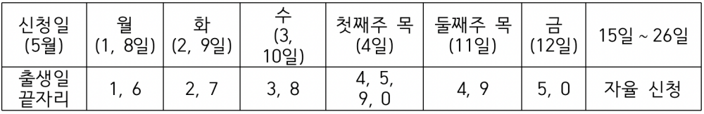 ※ 신청일이 공휴일인 5월 5일(금) 5부제 대상자는 5월 4일에 신청