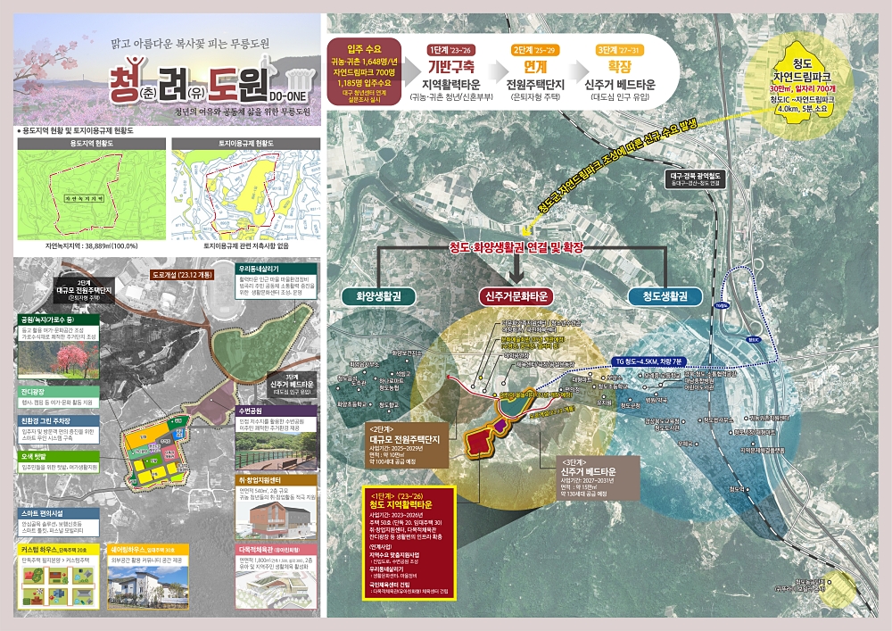 경북도는 청도군 화양읍 범곡리 일원 3만9천여㎡ 부지에 올해부터 2026년까지 4년간 총사업비 396억 원을 투입해 수요자 맞춤형 단독주택 50호, 진입도로와 수변도로 등 기반시설과 어린이 체육센터를 조성하고, 주변 복숭아밭(무릉도원)을 활용한 녹지 텃밭도 조성할 계획이다.