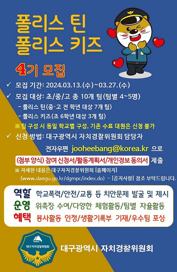 대구광역시 자치경찰위원회는 3월 13일(수)부터 27일(수)까지 15일간 폴리스-틴(Teen)·키즈(Kids) 제4기를 모집한다.