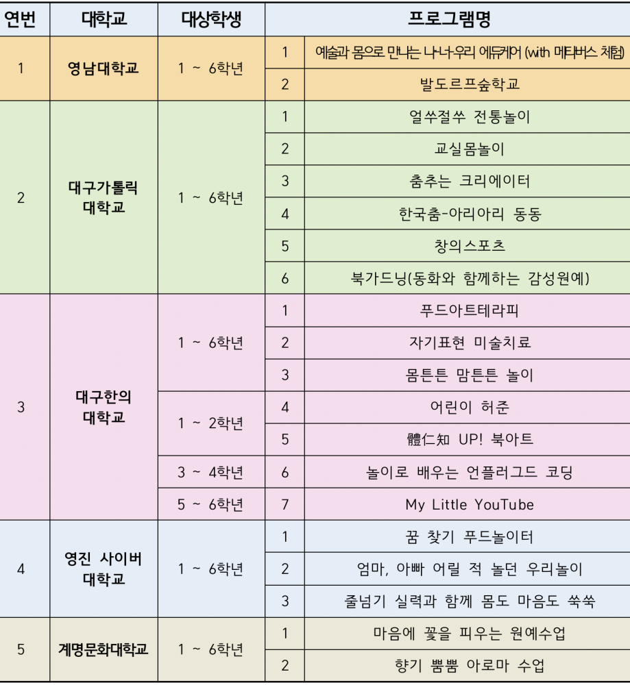 선정된 대학은 올해 4월부터 내년 2월까지 남구, 달서구 소재 희망 초등학교를 대상으로 대학의 특성화된 프로그램을 운영하게 된다. 특히, 올해는 학생들의 정서를 함양할 수 있는 ▲발도르프숲학교, ▲창의스포츠, ▲향기 뿜뿜 아로마 수업 등의 문화예술 및 놀이·체험중심 활동 프로그램 뿐만 아니라, ▲언플러그드 코딩, ▲My Little Youtube 등의 시대변화를 반영한 미래형 신수요 프로그램을 도입하여 학생들에게 디지털 교육 기회를 제공할 예정이다.