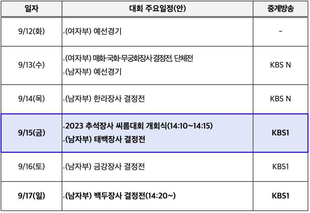 문화체육관광부(이하 문체부)가 지원하고 대한씨름협회가 주최하는 ‘2023년 추석장사 씨름대회’가 9월 12일(화)부터 17일(일)까지 수원특례시 수원종합운동장실내체육관에서 열리고 있다.