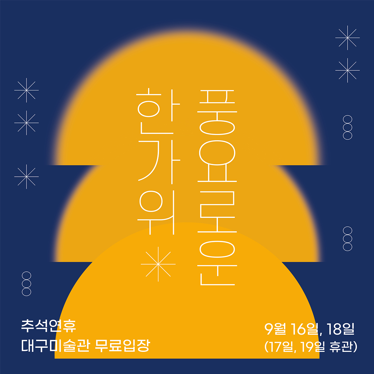 대구문화예술진흥원 대구미술관은 연휴 기간 중 9월 16일(월), 18일(수) 무료로 개관하고, 추석 당일인 17일(화), 19일(목) 휴관해 시민들의 명절 문화생활을 함께한다.