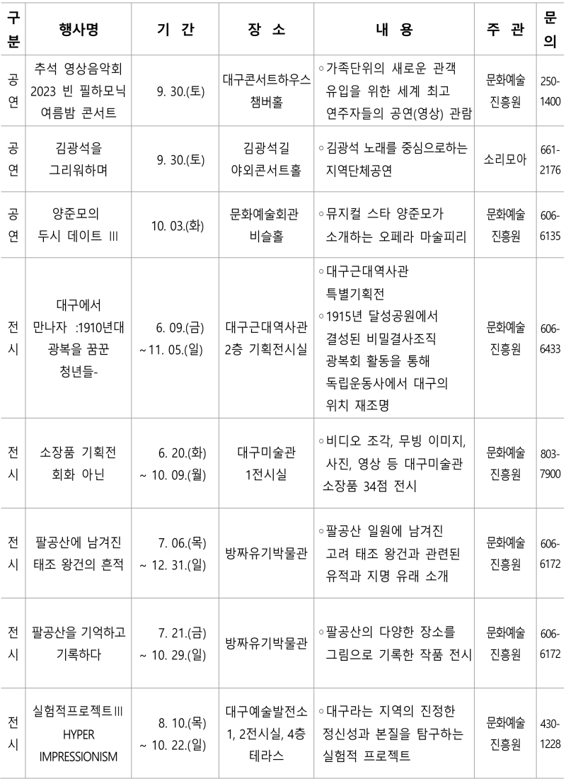 주요 공연으로는 ▲9월 23(토), 24(일) 양일간 대구스타디움 서편광장에서 열리는 파워풀대구 뮤직페스타 ▲9월 30일(금) 대구콘서트하우스 챔버홀에서 진행되는 추석 영상음악회 ‘2023 빈 필하모닉 여름밤 콘서트’ ▲10월 3일(화)에는 오페라 ‘마술피리’의 주요 장면을 해설과 함께 압축해서 감상할 수 있는 양준모의 두시 데이트Ⅲ가 문화예술회관 비슬홀에서 개최된다. 특히 파워풀대구 뮤직페스타는 공연 실황을 대구관광메타버스앱인 메타라이브로 생중계함으로써 대구관광의 지평을 넓히는 새로운 포인트가 될 예정이다.