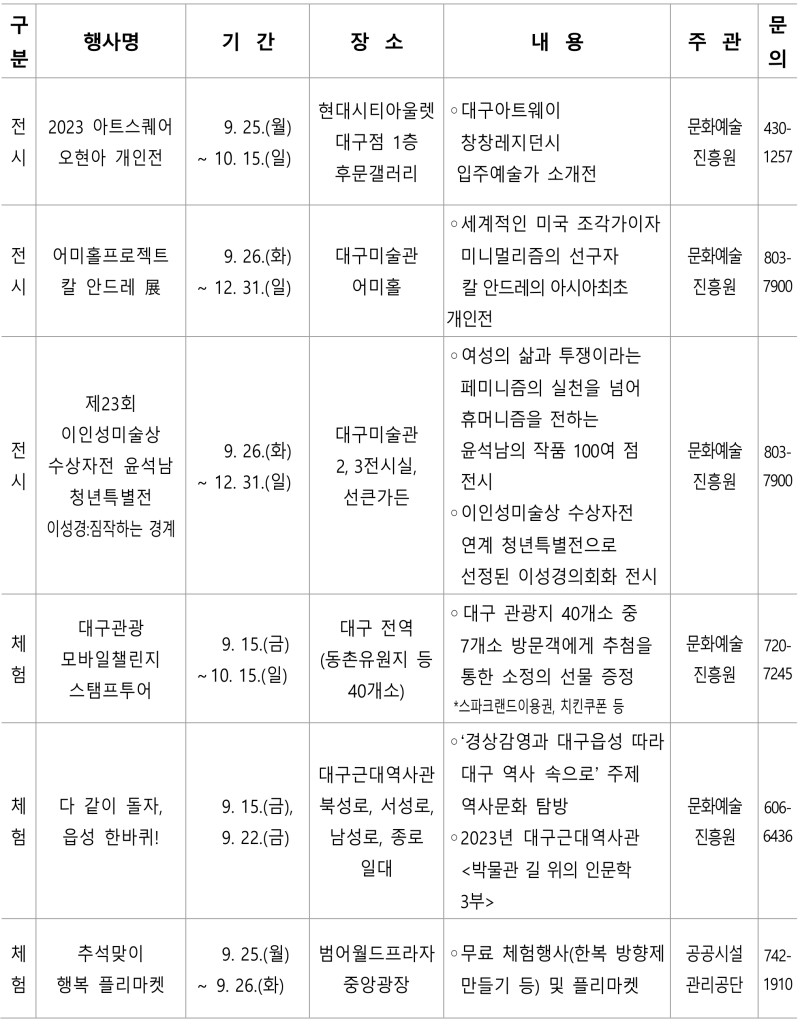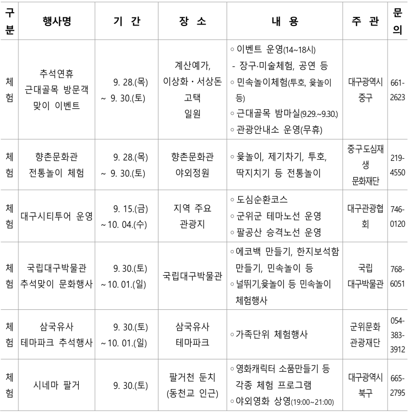 대구광역시는 역대급으로 긴 올 추석 연휴(6일간)를 맞이해 고향을 찾은 귀성객들과 가족이 함께 즐길 수 있는 전시, 공연, 체험행사 등 다양한 문화프로그램을 운영한다.