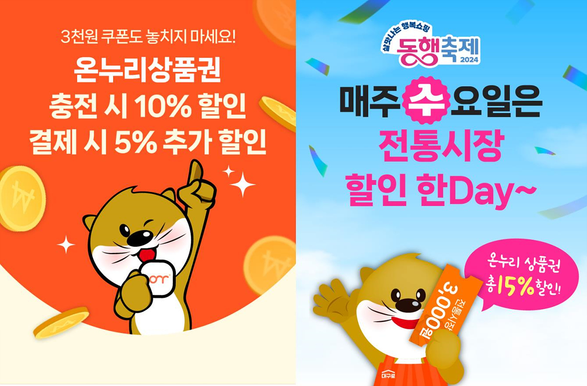 그리고 ‘대구로’ 전통시장관에 입점한 30개 시장*, 356개 상점을 대상으로 매주 수요일 1만 원 이상 구매 시 3천 원 할인 쿠폰 제공과 더불어 지난 8월 5일(월)부터 전국 최초 ‘대구로’에서 결제 가능한 ‘충전식 카드형 온누리상품권’으로 사용 시 5% 추가 할인과 15% 특별충전 할인(~ 9.30.)으로 총 20% 할인혜택을 누릴 수 있다.