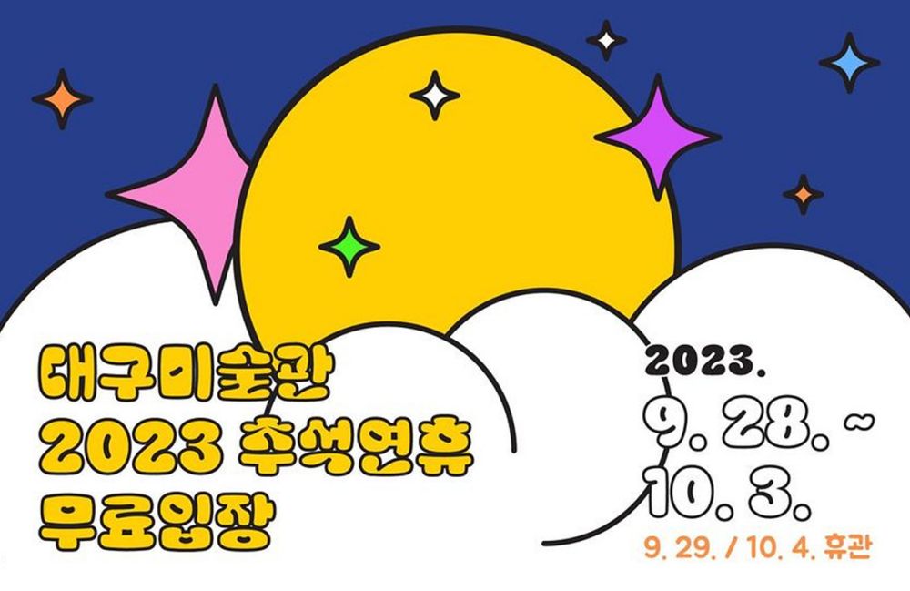 대구미술관은 추석, 임시 공휴일이 있는 황금연휴(9월 28일~10월 3일)에 추석 당일만 휴관하고, 5일간 무료 개관하여 시민들의 한가위 문화생활을 함께 한다. (휴관일: 추석 당일, 10월 4일)
