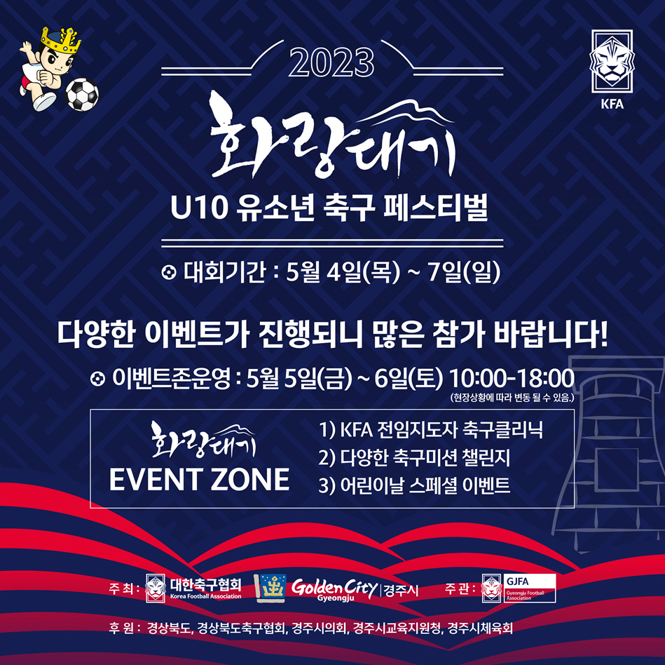 축구 꿈나무 등용문인 ‘2023 화랑대기 U-10 축구 페스티벌’이 이달 4일부터 7일까지 4일간 경주시 알천체육공원에서 펼쳐진다.