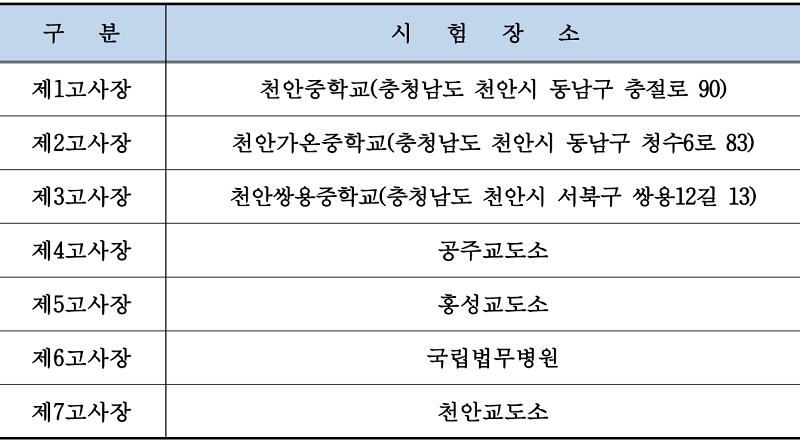 2024년 제1회 초졸·중졸·고졸 검정고시 시험장소는 교통 여건과 학교 규모 등 제반 사항을 고려하여 천안시 소재 천안중학교, 천안가온중학교, 천안쌍용중학교 3개교로 정하였으며, 재소자 응시자를 위해 4개의 교정기관에 별도시험장을 운영한다.
