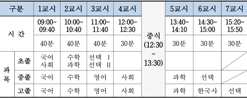응시자는 신분증, 수험표, 컴퓨터용 사인펜(초졸은 검정 볼펜) 등을 지참하여 시험 당일 오전 8시 40분까지 고사실 입실을 마쳐야 하며, 2교시 이후부터는 시험 시작 10분 전까지 입실하여야 시험에 응시할 수 있다.
