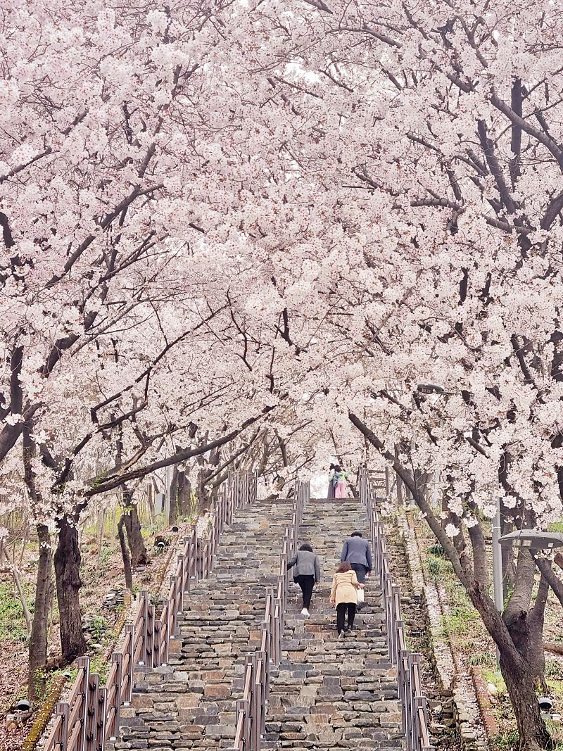 벚꽃의 계절이 돌아오자 대구 북구 침산공원 벚꽃돌계단은 만개한 벚꽃을 보러 나온 사람들로 가득했다.