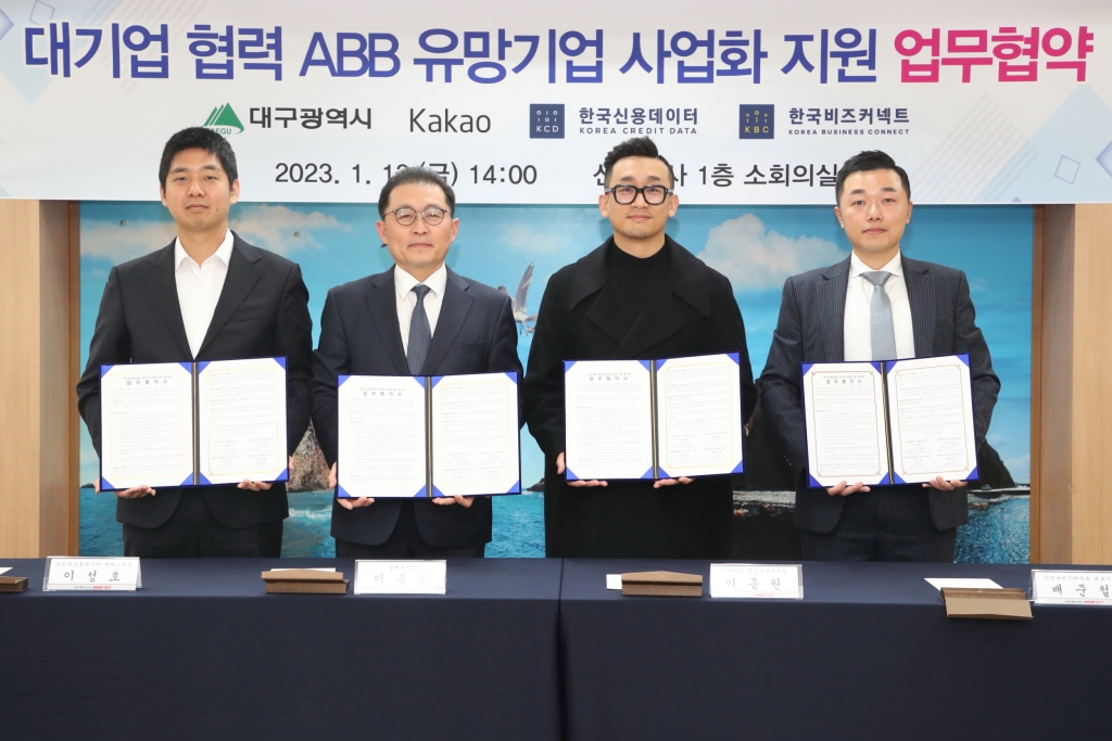 대구시는 1월 13일(금), 대구시청 산격청사에서 국내 빅테크기업 (주)카카오, (주)한국신용데이터 및 지역기업 (주)한국비즈커넥트와 함께 ‘대기업 협력 ABB 유망기업 사업화 지원’을 위한 업무협약식을 개최했다.
