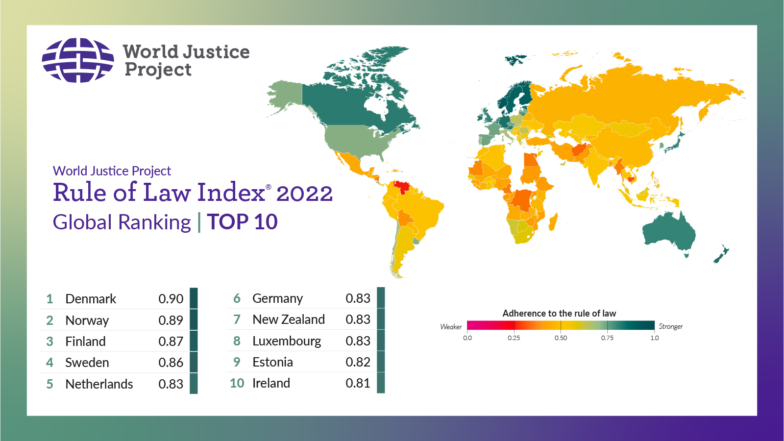 한편 2022년 법치주의 지수에서 1위를 차지한 국가는 덴마크이며 노르웨이, 핀란드, 스웨덴, 네덜란드, 독일, 뉴질랜드, 룩셈부르크, 에스토니아가 뒤를 이었다. 아시아 국가 중에는 일본 16위, 싱가포르 17위, 한국은 19위에 머물렀다.