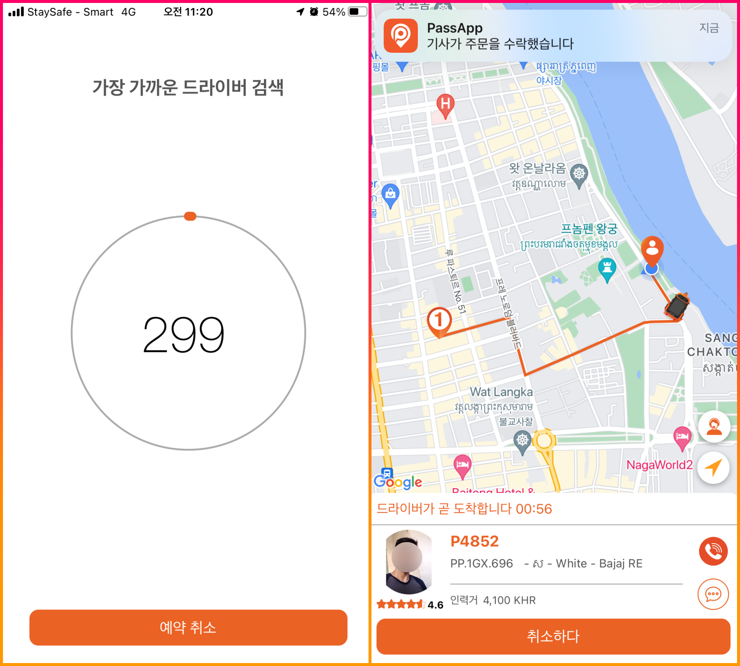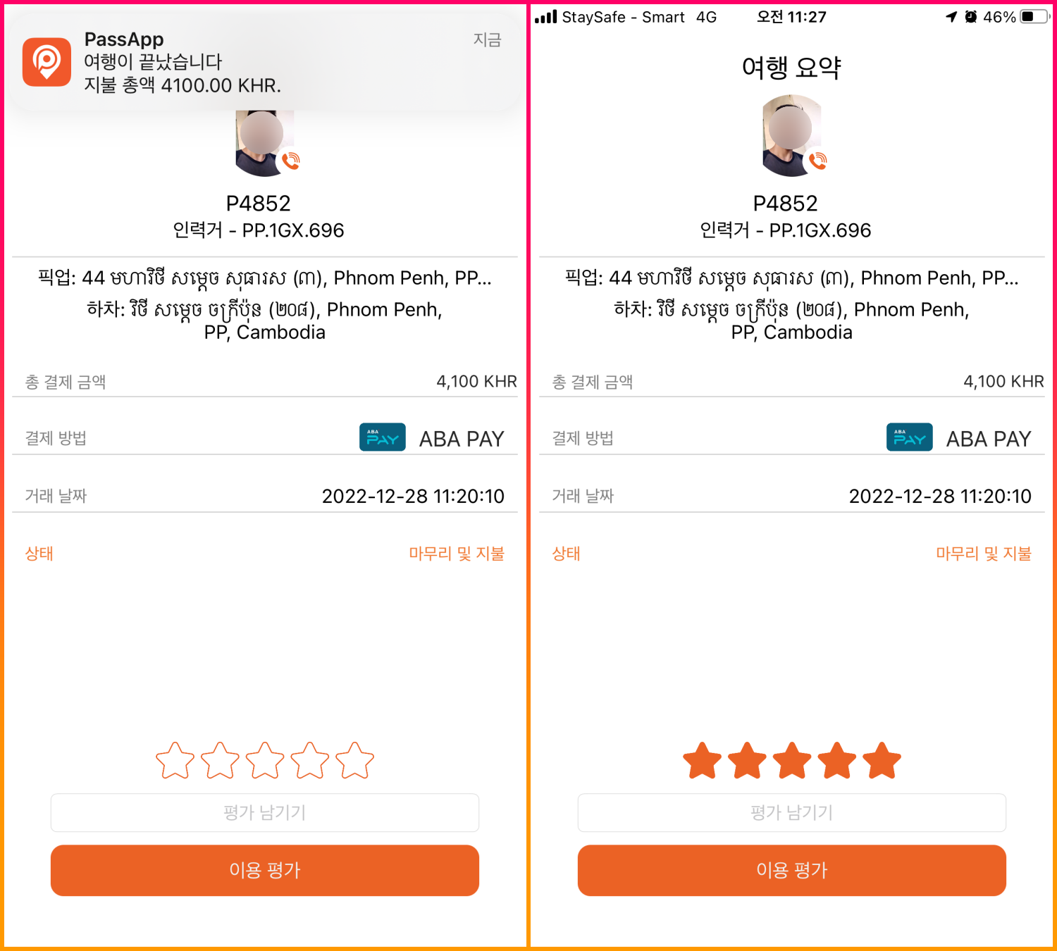이렇게 캄보디아에서도 호출앱을 사용하면 따로 가격을 흥정할 필요도 없고 기사 도착 예상 시간, 운행 시간, 운행 경로 등 안전하고 편하게 이동이 가능하다. ABA PAY같은 간편결제앱까지 연동하면 그저 승차지에서 탑승했다가 도착하면 내리기만 하면 된다. 보다 간편하고 안전한 이동을 원한다면 캄보디아를 여행할 때는 패스앱을 필수로 설치하자.