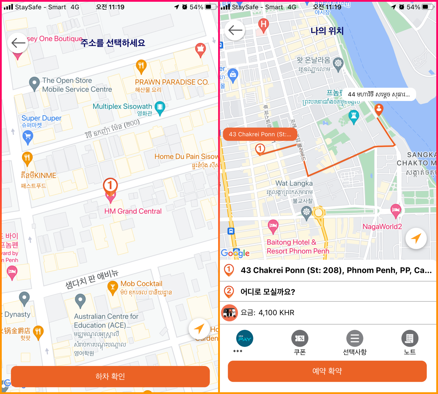 다음으로 하차할 곳을 선택한다. 주소를 입력하거나 지도에서 직접 선택하면 된다. 하차지로 프놈펜 'HM Grand Central' 호텔을 선택하겠다. 하차할 곳을 선택하고 '하차 확인' 버튼을 누르면 예상 운행경로와 요금을 확인 할 수 있다. 예약 정보를 확인 후 '예약 확약' 버튼을 누른다.