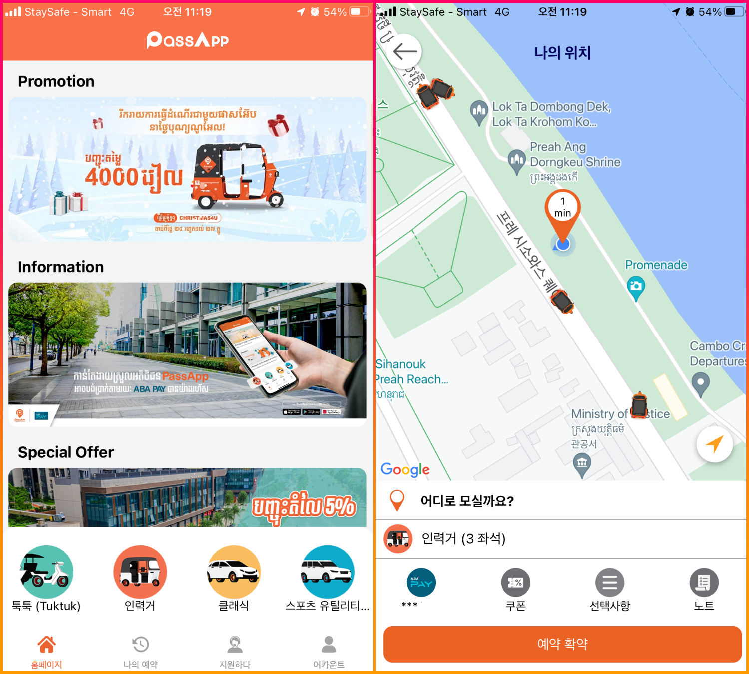 그 중 패스앱은 다른 택시앱에 비해 프놈펜, 시엠립, 시하누크빌 등 대표적인 관광지 외에도 지방에서도 사용이 가능하고 더 많은 지도정보와 정확성으로 필자는 캄보디아에서 약 1년여간 생활하면서 주로 패스앱을 사용했다.