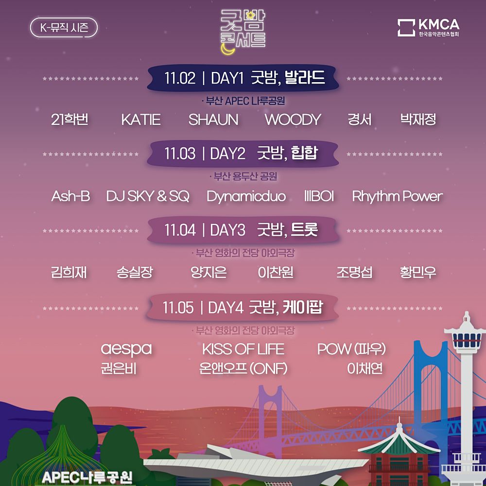 굿밤콘서트는 케이(K)-뮤직 시즌의 일환으로, 부산의 매력적인 야경명소와 음악이 만나 아름다운 밤을 만들어가는 뮤직 콘서트다.