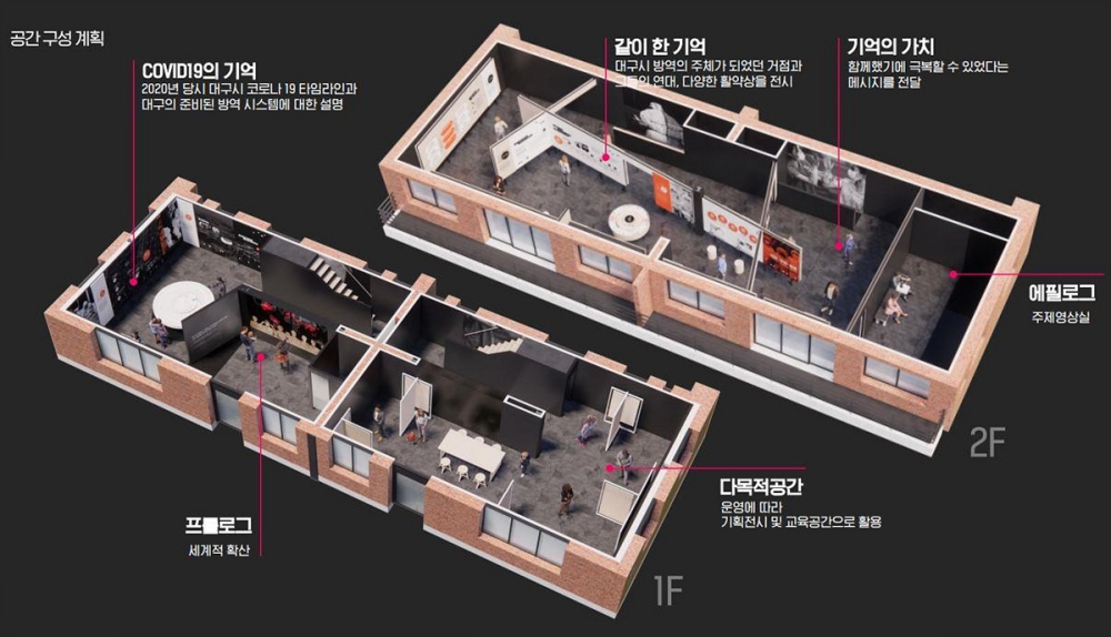 1층은 코로나19 발생 초기 특별재난지역 선포와 함께 멈춰버린 대구의 모습과 코로나19 유행 상황을 타임라인으로 구성했고, 다목적 전시공간에는 코로나 극복에 힘쓴 대구 시민들의 19가지 미담과 시민공모전 자료들이 전시된다.