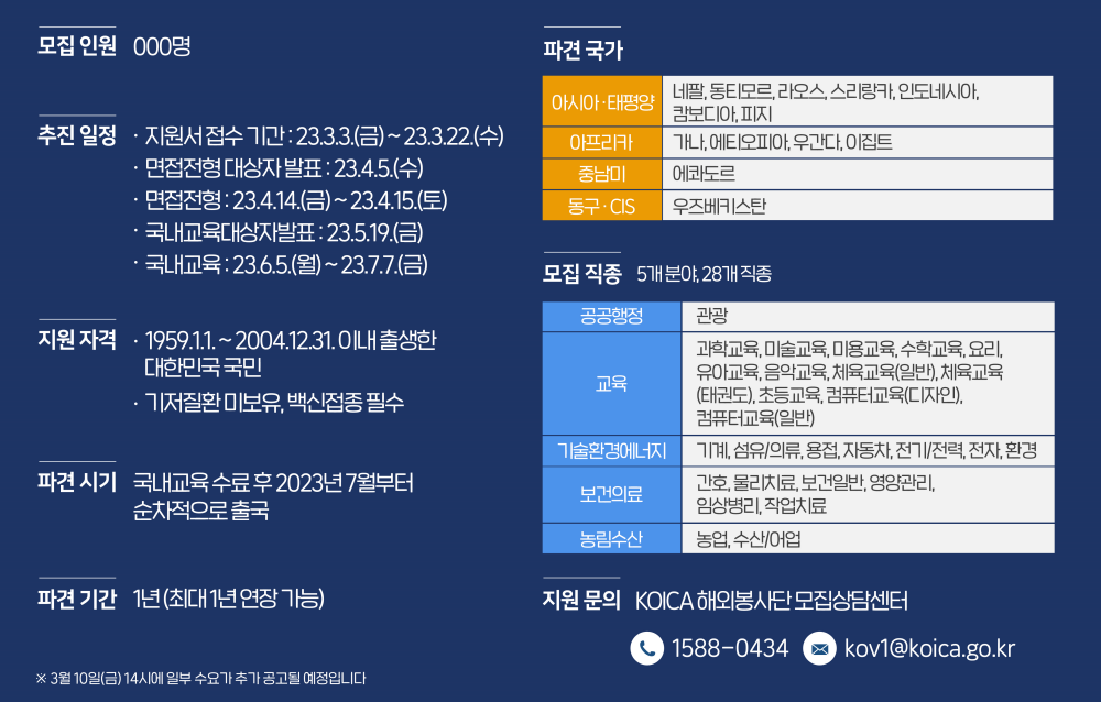 자세한 모집 안내문과 지원서 직종별 세부 활동내역, 직종별 모집 총괄표는 코이카 봉사단 홈페이지(https://kov.koica.go.kr/)를 참고하면 된다.