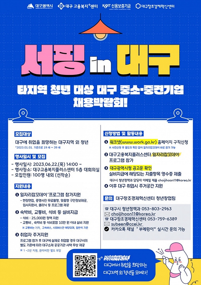 시는 지난달 3일 신용보증기금, 대구지방고용노동청과 협약을 통해 타지역 청년의 대구 취업과 정착을 위한 경로를 구축하여 지난달부터 매월 넷째 주 목요일에 대구 중소·중견기업 채용박람회를 개최하고 있다.