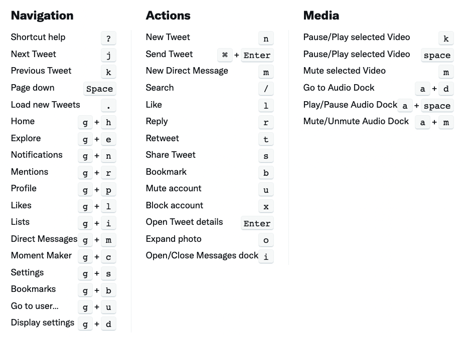트위터에서 키보드 '?' 키를 치면 사용할 수 있는 전체 단축키를 확인할 수 있다. '?' 키를 치면 나오는 트위터 단축키(Keyboard shortcuts)는 아래와 같다.