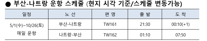 티웨이항공은 △인천 △청주 △부산에서 출발하는 베트남 나트랑 직항 노선을 운항 중이며, 금번 부산발 나트랑 신규 취항 외에도 오는 6월 19일 대구발 나트랑 직항 노선도 신규 취항하며 지역민들의 동남아 여행 편의 향상에 앞장서 나간다.