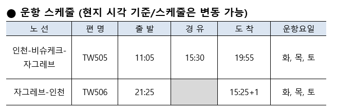 귀국편은 직항으로 운영되며, 자그레브 국제공항에서 오후 9시 25분 출발해 인천국제공항에 다음 날 오후 3시 25분 도착하는 스케줄로 비행시간은 약 11시간 소요된다. 인천-자그레브 노선은 비즈니스 세이버 좌석과 이코노미 좌석 승객 모두에게 무상 기내식이 각 2회씩 제공될 예정이며, 티웨이항공의 A330-300 항공기(347석)를 투입해 양국 관광객과 상용 고객의 편의를 제고할 것으로 기대를 모은다.