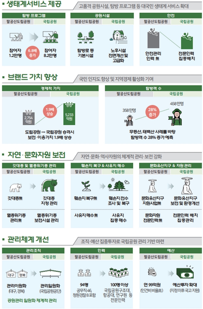 또한, 국가관리를 통해 팔공산의 우수한 자연·문화자원이 보다 체계적으로 관리돼 탐방객들에게는 높은 수준의 생태서비스를 제공할 수 있고, 그간 재정상 사유로 시행이 어려웠던 생태탐방원, 하늘전망대, 숲 체험시설, 무장애 탐방로 조성 등 인프라 구축으로 지역 관광활성화 유도와 교통약자의 접근성도 크게 개선될 것으로 전망된다. 그리고, 국립공원지킴이, 자연환경해설사 등 지역주민 직접고용을 통한 일자리 창출과 국립공원 내 사유지 매수사업을 통해 사유재산권 보호에도 앞장설 계획이다.