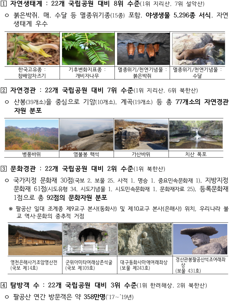 현재 팔공산은 유서 깊은 문화유산, 자연자원과 경관을 많이 보유한 국가를 대표하는 역사·문화·생태·경관 가치를 지닌 곳으로, 국보 2점, 보물 25점을 비롯해 문화자원 92점을 보유하고 있으며, 멸종위기 야생생물 15종을 포함하여 야생동물 5,296종과 77개소의 자연경관 등 전국 최상위 수준의 문화와 자연자원·경관 보유로 국립공원으로서 가치가 충분한 것으로 입증됐다.