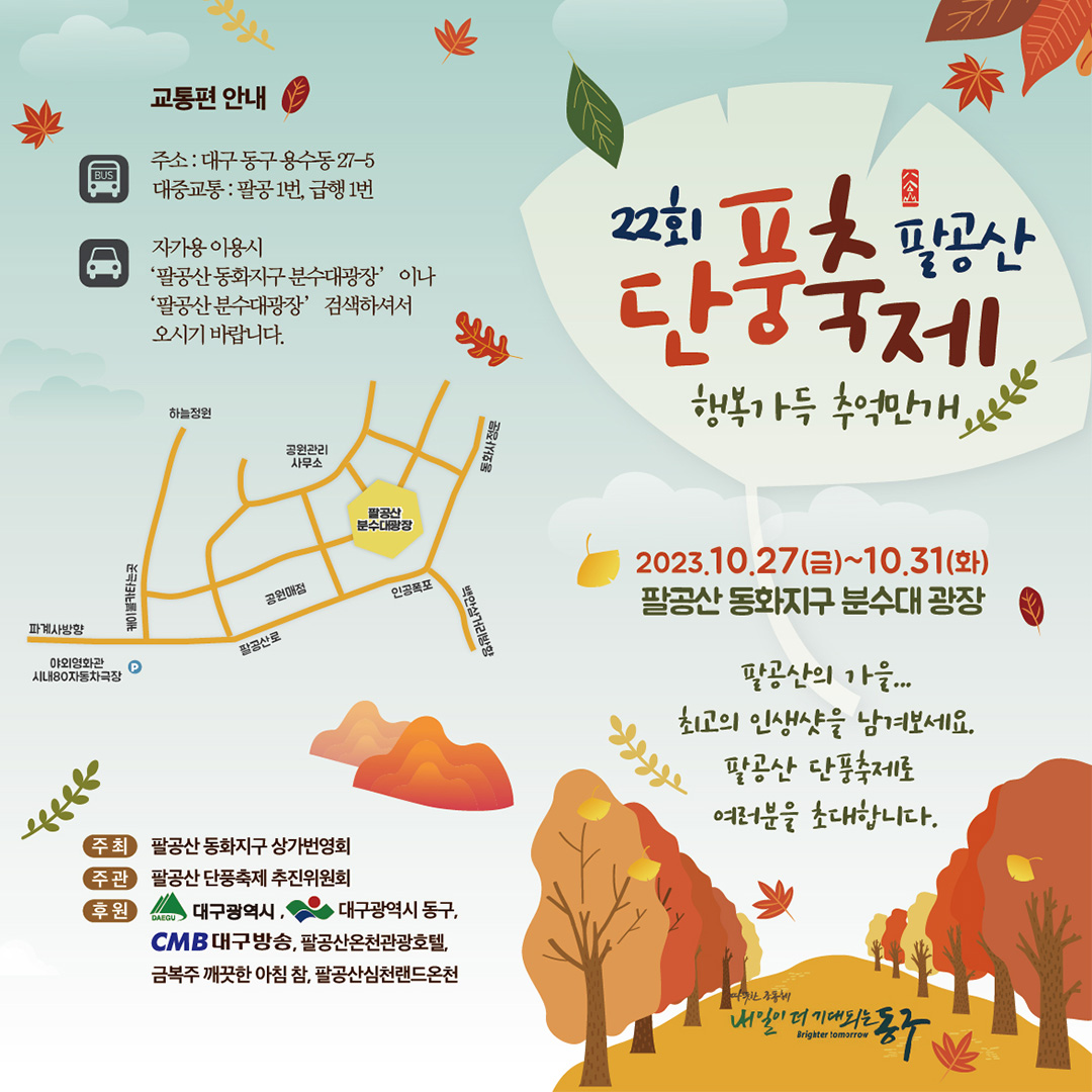 제22회 팔공산 단풍축제가 오는 27일부터 31일까지 5일간 팔공산 동화지구 분수대 광장에서 열린다. 팔공산동화지구상가번영회(회장 김남호) 주최로 마련된 이번 축제는 ‘행복가득, 추억만개’를 주제로 진행된다.