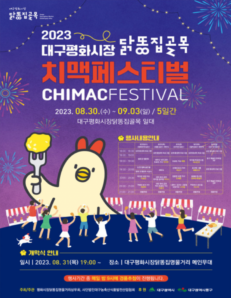 대구 동구에서도 치맥 페스티벌이 열린다. 2023 대구평화시장 닭똥집골목 치맥페스티벌이 오는 30일부터 9월3일까지 5일간 평화시장 닭똥집골목 일대에서 개최된다.