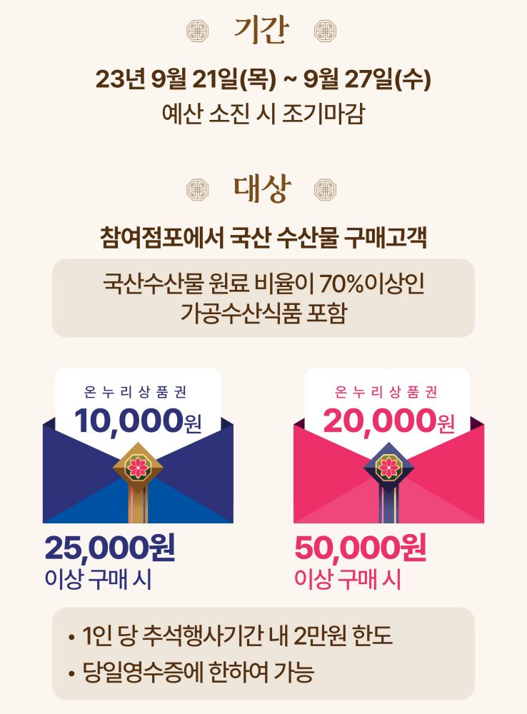 환급액은 당일 구매금액 2만 5천 원 이상 5만 원 미만은 1만 원, 5만 원 이상은 2만 원까지 온누리상품권으로 환급되며, 구매한도는 1주일 동안 1인당 최대 2만 원이다.