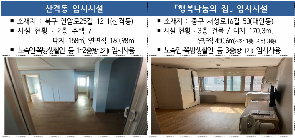 하절기 자연재난으로 응급 잠자리의 일시적인 수요 증가를 대비해 북구 산격동 ‘임시주택’과 중구 대안동의 ‘행복나눔의 집’ 일부를 임시 긴급 보호시설로 활용하여, 노숙인·쪽방생활인 등 주거취약계층의 보호·위기 관리체계를 더욱 촘촘하고 두텁게 구축·강화할 계획이다.
