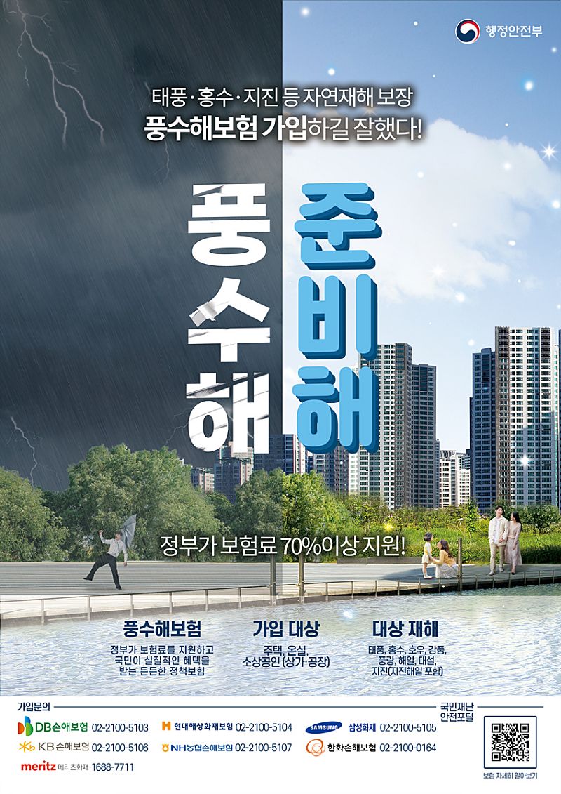 풍수해보험은 행정안전부가 주관해 시행하는 정책보험으로 태풍, 호우, 대설, 강풍, 풍랑, 해일, 대설, 지진 등 자연재난이 발생하였을 경우 시민들에게 현실적인 보상이 지급돼 빠른 피해 복구와 생계안정을 위해 시행되는 선진국형 재난관리 보험제도이다.