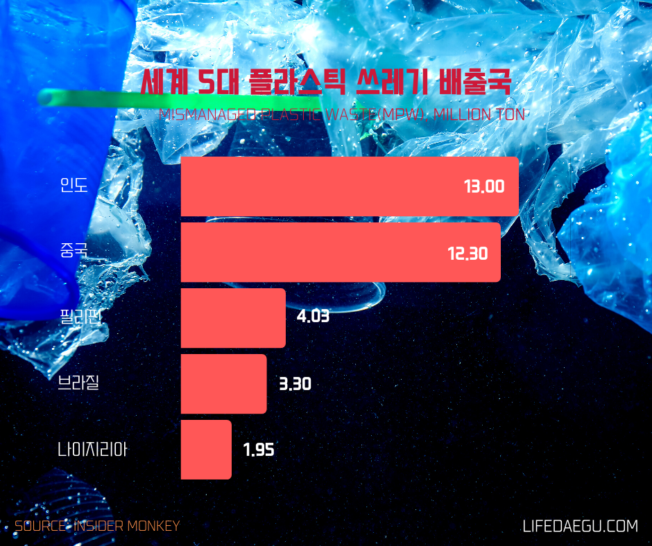 미국의 투자전문매체 인사이더몽키(Insider Monkey)는 MPW(Mismanaged Plastic Waste)를 기준으로 플라스틱 쓰레기를 가장 많이 배출하는 5대 국가를 발표했다.