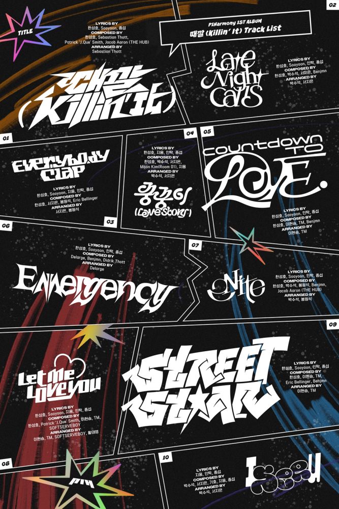 타이틀곡 ‘때깔 (Killin’ It)’ 외에도 ‘Late Night Calls’, ‘Everybody Clap’, ‘꿍꿍이 (Love Story)’, ‘Countdown To Love’, ‘Emergency’, ‘2Nite’, ‘Let Me Love You’, ‘Street Star’, ‘I See U’까지 피원하모니의 색깔을 담은 10곡이 탄탄하게 수록되어 있다. 특히 멤버 종섭은 타이틀곡을 비롯해 전곡 작사에 참여했으며, 기호, 지웅, 인탁도 다수의 곡 작사, 작곡에 참여해 완성도를 높였다.
