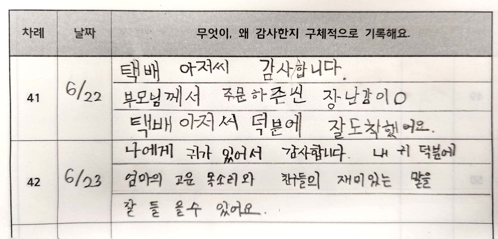 6학년 이성은 학생은 “감사 일기를 쓰며서 나의 하루를 되돌아보니 나를 둘러싼 세상에 감사함을 느끼고, 나도 다른 사람에게 도움을 주는 사람으로 살아가고 싶다는 생각이 들었다.”고 말했다.