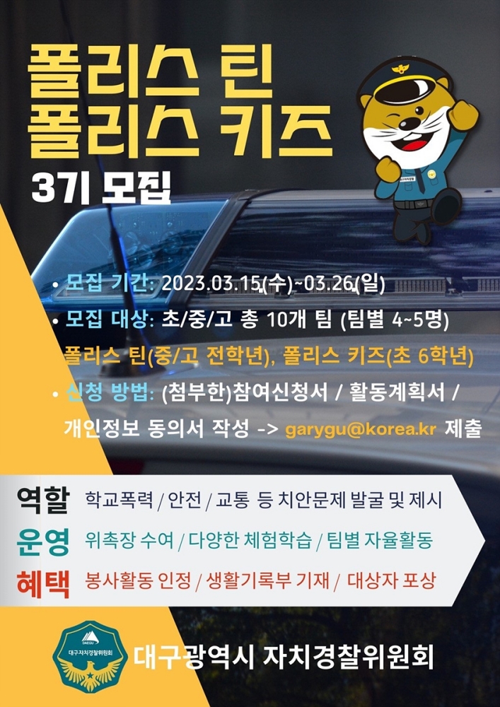 대구시 자치경찰위원회는 3월 15일(수) ~ 26일(일)(12일간) 폴리스-틴(Teen)·키즈(Kids) 3기를 모집한다. 폴리스-틴(Teen)·키즈(Kids)는 대구차치경찰위원회와 교육청 연계 활동으로 청소년들이 생활 주변 치안 문제를 발굴해 구체적 대안을 모색하는 프로그램이다.