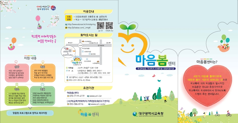 대구시교육청은 학교폭력 피해 학생의 심리 치유와 정서적 안정을 지원하기 위해 대구형 학교폭력 피해학생 지원 전담 기관인‘마음봄센터’를 운영한다.