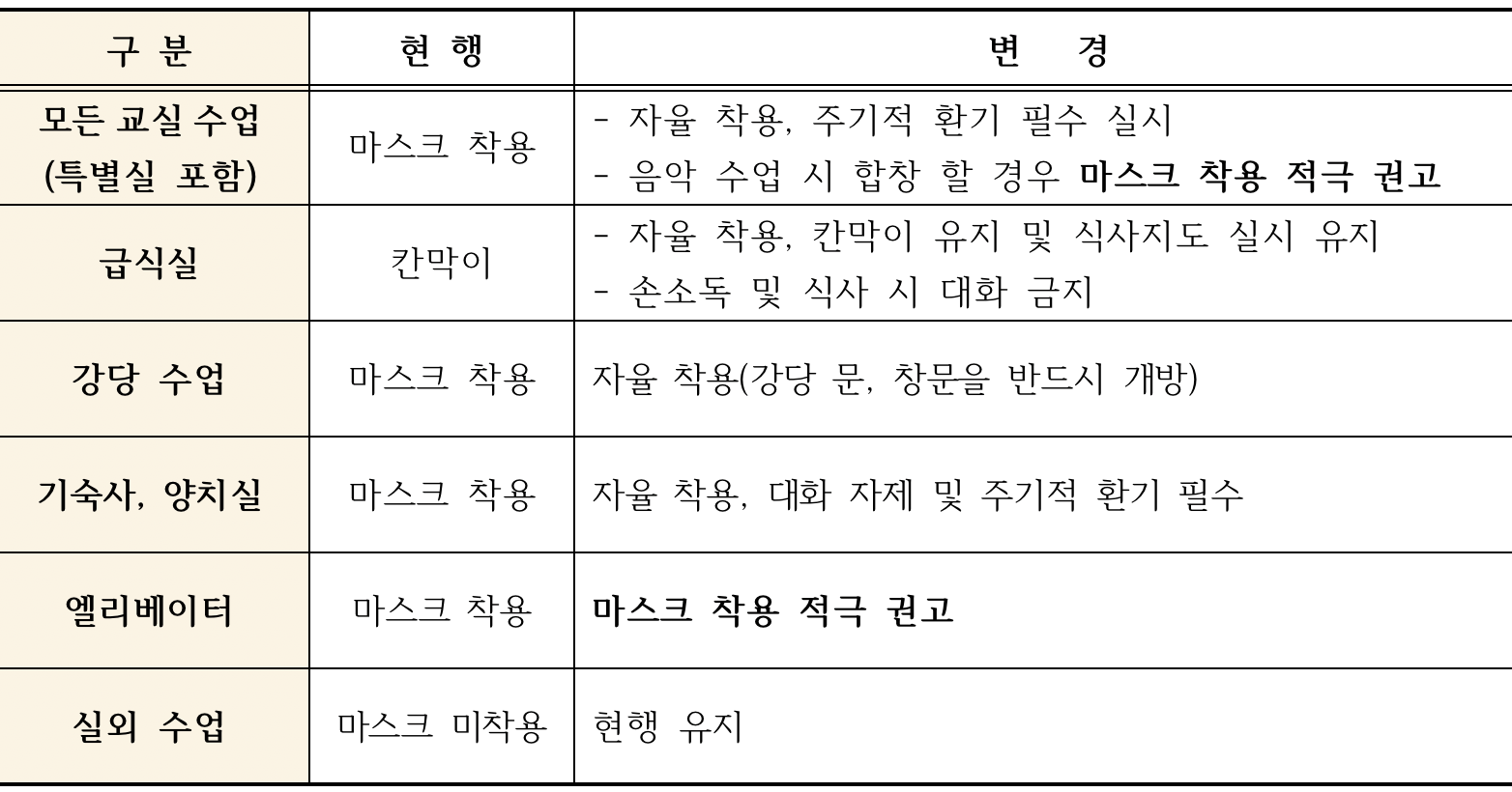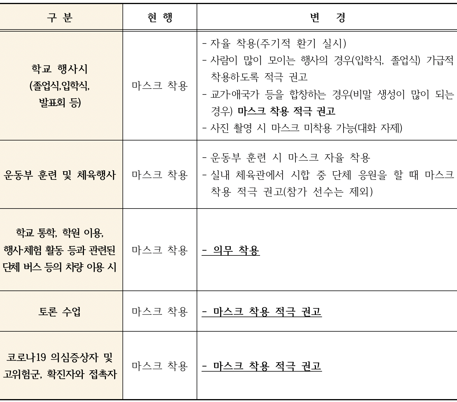 ※ 그 밖에 다수 밀집된 실내에서 비말 생성행위가 많아 교육시설의 장(학교장 등)이 필요하다고 판단할 경우 마스크 착용 적극 권고할 수 있음