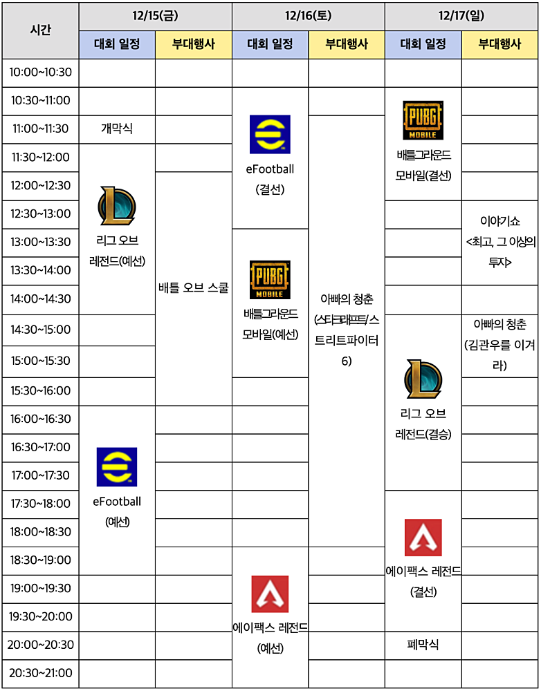 이번 대회에서는 게임과 관련한 다양한 부대행사도 개최한다. 12월 15일에는 전라남도 내 6개 중·고등학교 총 8개팀이 참가하는 ‘배틀 오브 스쿨’ 대회를 진행한다. 이 대회는 ‘리그 오브 레전드 칼바람 나락(무작위 총력전)’을 종목으로 펼치는 중고등학생 대항전이다. 12월 16일에는 부모 세대가 이스포츠 실력을 겨루는 ‘아빠의 청춘:스타크래프트’, ‘아빠의 청춘:스트리트 파이터 6’ 대회가 열린다.