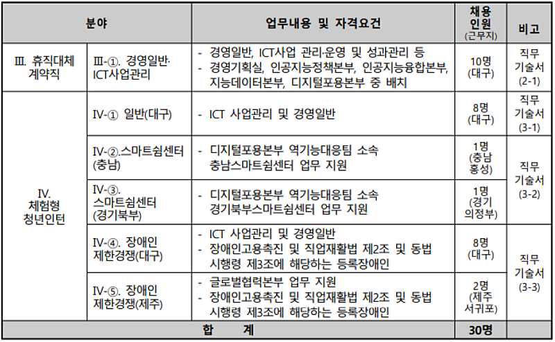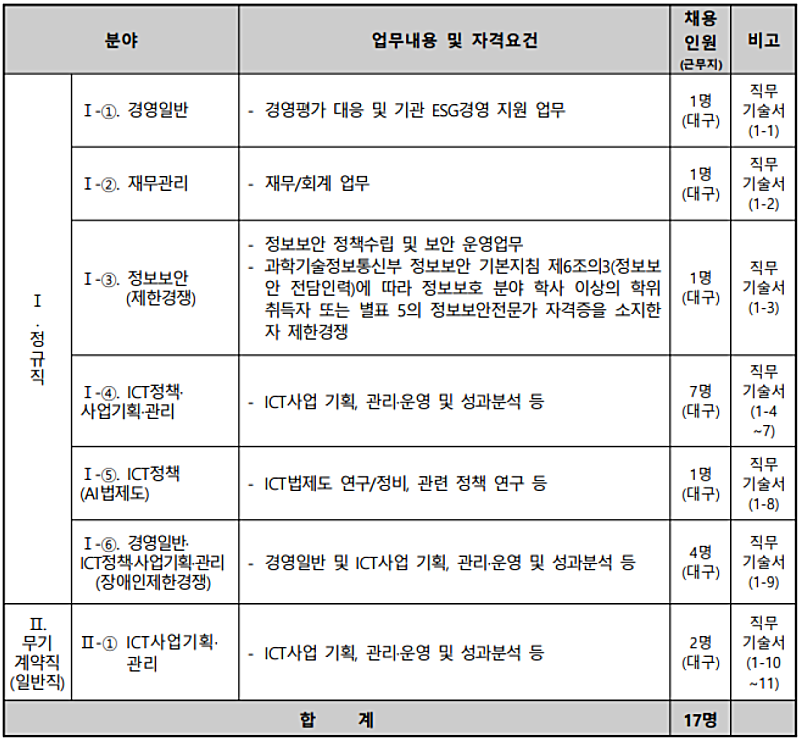 NIA는 정규직 및 무기계약직, 육아휴직대체계약직, 체험형 청년인턴 총 47명을 채용한다. 정규직 및 무기계약직 채용규모는 △경영일반 △재무관리 △정보보안 △ICT정책·사업기획․관리 △장애인 제한경쟁 등 7개 분야 17명이다.