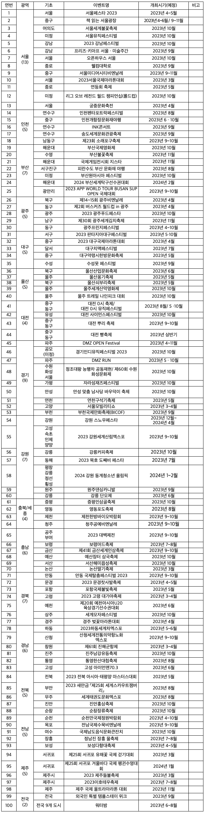 100선에 선정된 주요 대규모 이벤트로는, ▲ 봄 소풍을 주제로 한 미식, 뷰티, 한류 축제의 장 ‘서울페스타 2023’, ▲ 세계적인 정원축제 ‘순천만국제정원박람회’, ▲ K-아트의 매력을 직접 느낄 수 있는 ‘프리즈·키아프 서울’과 전 세계 현대미술 거장들의 작품을 만날 수 있는 ‘광주비엔날레’, ▲ 국내 최대 공연관광 페스티벌 ‘웰컴대학로’와 거리예술축제 ‘광주프린지예술축제’, ▲ 아시아 최대 영화제이자 국내 유일의 필름마켓 ‘부산국제영화제’, ▲ 국제게임전시회 ‘지스타’와 이스포츠 최고 세계 대회인 ‘월드 챔피언’ 자리를 두고 대결하는 ‘LoL 월드 챔피언십(롤드컵)’, ▲ 대규모 국제 스포츠 행사인 ‘2024 부산세계탁구선수권대회’, ‘2024 강원동계청소년올림픽 등이 있다.