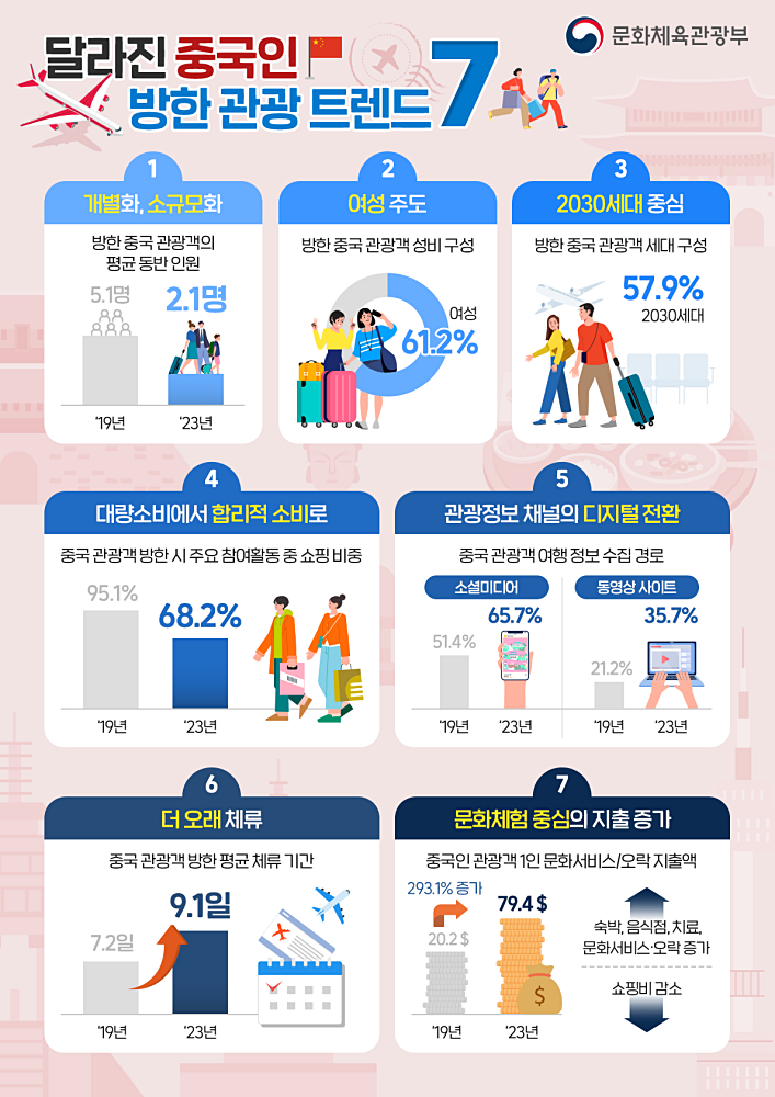문화체육관광부(이하 문체부)는 한국문화관광연구원과 함께 코로나 이후 『방한 중국관광 트렌드 변화 분석』보고서를 발표하며, 2023년 중국인 방한 관광 7대 트렌드를 소개했다.