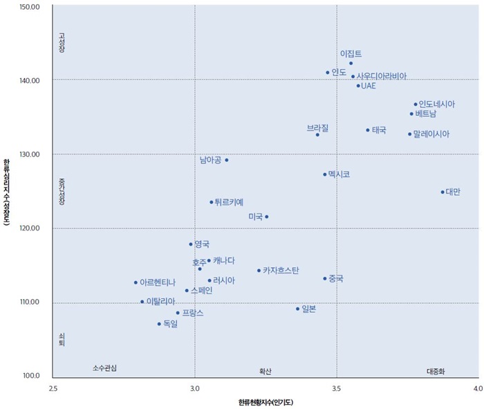 * 한류현황지수(인기도) : 한류의 현재 인기와 대중화 정도. 0~2.5 미만: 한류소수관심단계, 2.5~3.5 미만: 한류확산단계, 3.5 이상: 한류대중화단계로 분류