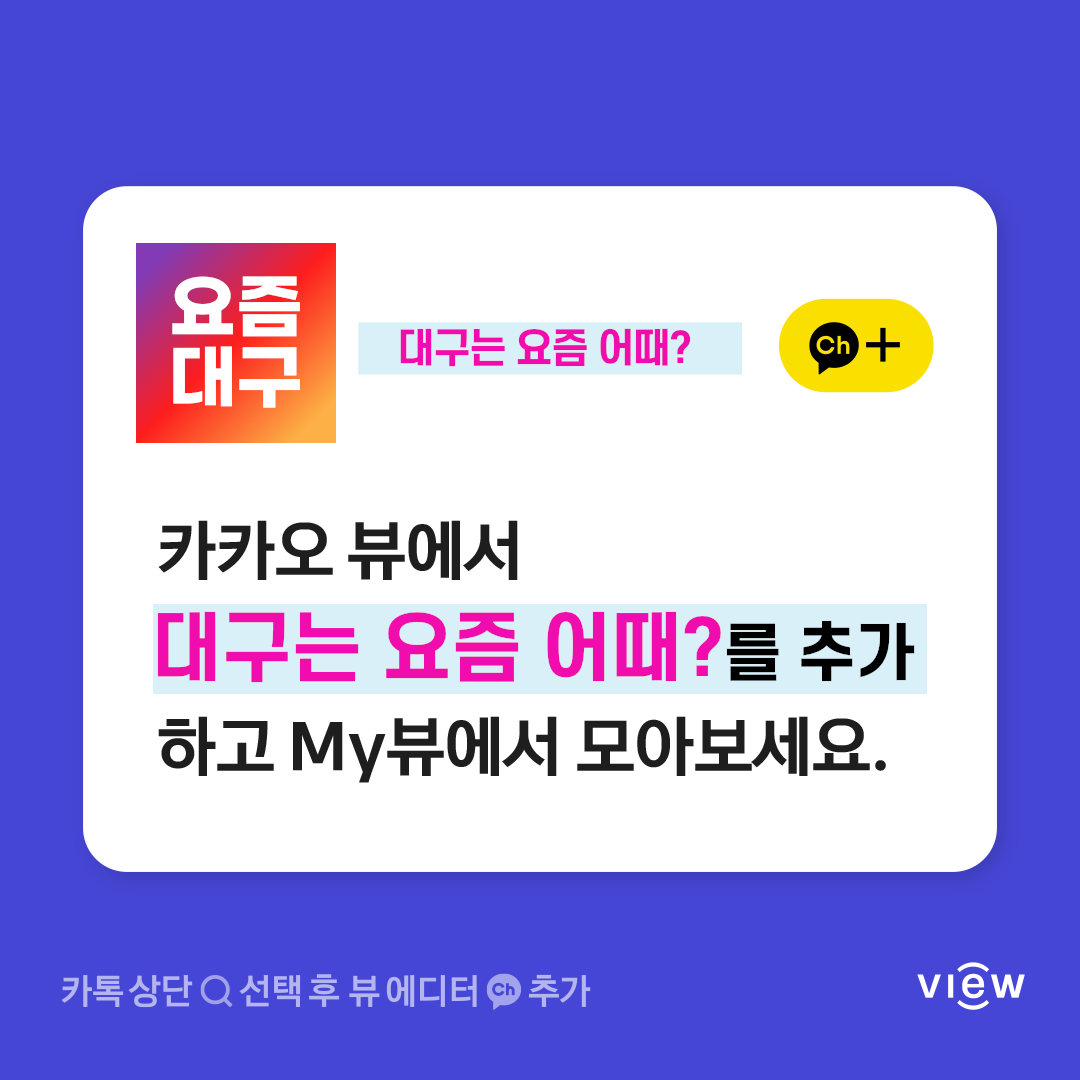 큐레이션 콘텐츠 서비스인 카카오뷰에서도 대구는 요즘 어때?를 만나볼 수 있다. 카카오뷰 검색에 '대구는 요즘 어때?'를 검색하면 쉽게 마이뷰에 추가해 편하게 대구와 경북의 다양한 소식을 받아볼 수 있다.