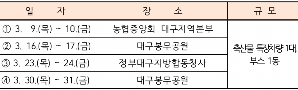 이번 행사는 특수 제작된 이동판매차량을 이용해 대현동 농협중앙회 대구지역본부 앞, 동구 봉무공원, 달서구 정부대구지방합동청사 등으로 소비자를 찾아가는 이동판매를 실시한다.