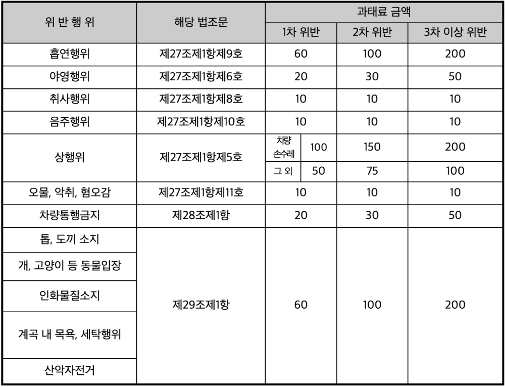 위반 시에는 사안에 따라 과태료를 부과하며 차박(야영), 차량통행금지 위반의 경우 50만원 이하, 개·고양이 등 동물을 데리고 입장하는 경우에는 200만원 이하의 과태료가 부과된다. 자세한 내용은 도립공원 홈페이지와 공고문을 확인할 수 있다.