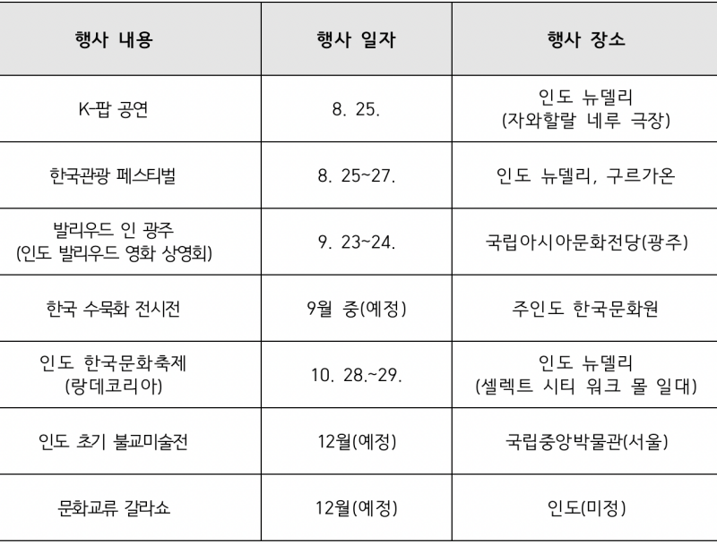 대한민국은 1973년 인도와 수교 이후 문화협정 체결(1974년), 서남아 최초 한국문화원 개원(2012년), 인도의 한국어 제2외국어 채택(2020년) 등 문화 분야에서 우호적인 관계를 지속적으로 발전시켜 왔다. 특히 올해는 양국 수교 50주년이 되는 해로서, 이를 기념하는 문화행사를 통해 미래세대 간 문화와 인적 교류를 더욱 활성화하는 교두보를 마련할 계획이다.