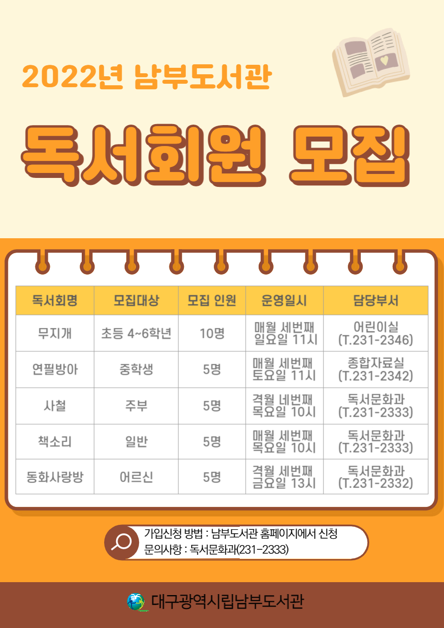 독서회 가입 신청은 1월 18일(화)부터 홈페이지(https://library.daegu.go.kr/bukbu)를 통해 선착순으로 할 수 있으며, 특히 새싹독서회는 어린이자료실(☎231-2635)로 전화 또는 방문 신청 가능하다.