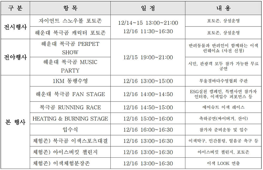 부산시는 오늘(14일)부터 12월 16일까지 3일간 해운대해수욕장 일원에서 「제36회 해운대 북극곰축제」가 개최된다고 밝혔다.